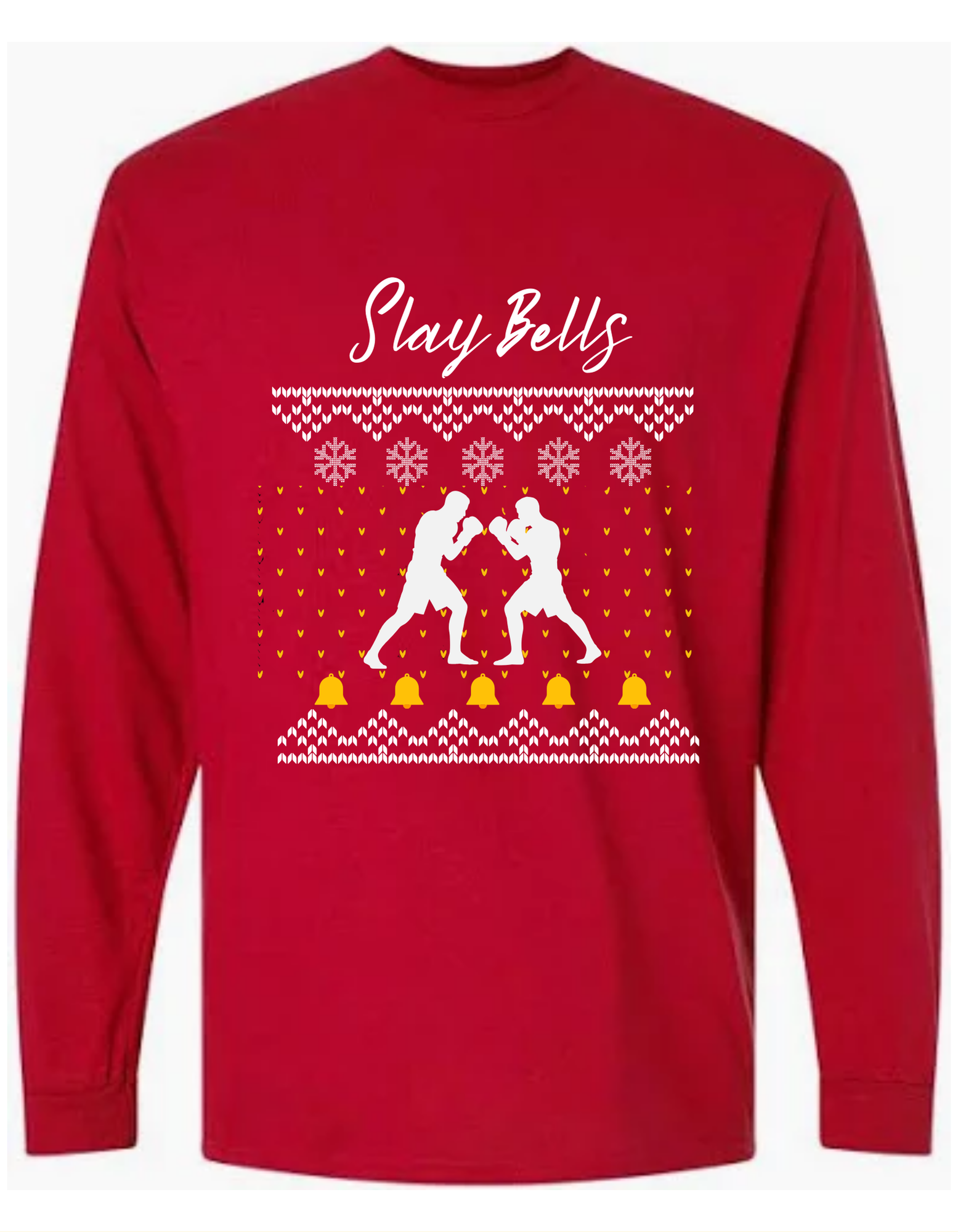 Ding, ding, ding! Can you hear the slay bells ring? Enjoy the holidays while showing off your boxing enthusiasm with this festive, long-sleeve red shirt.